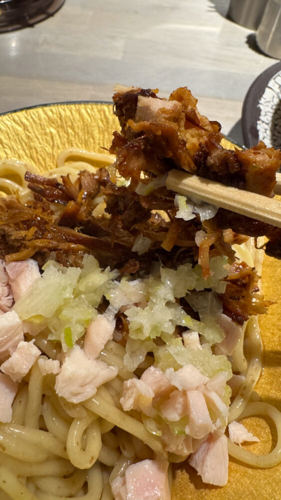 ▲豚の角煮を細かくしたような部分は甘辛くて美味。麺だけでなく具材も豊富なのが嬉しいですね。