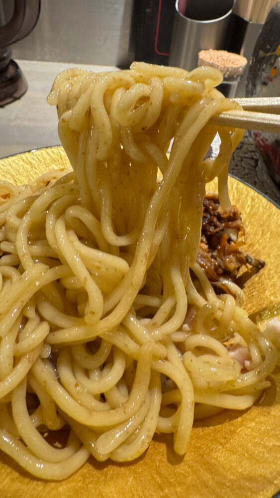 ▲和え玉の麺を残ったスープへつけ麺風にディップして食べてもアリです。でもまぜそば風に食べた方が個人的には好き。