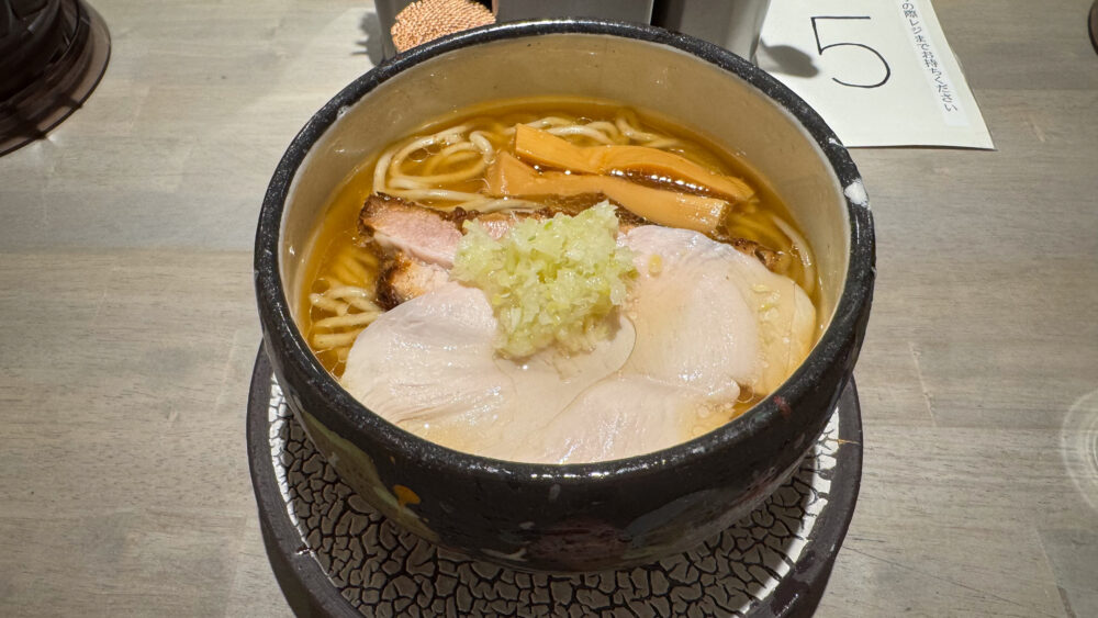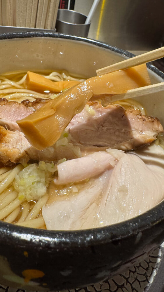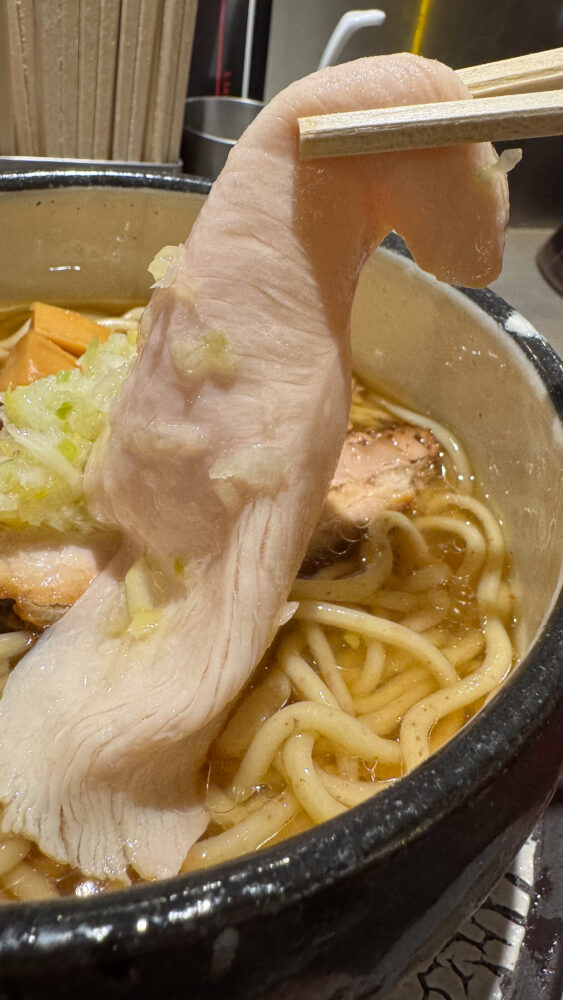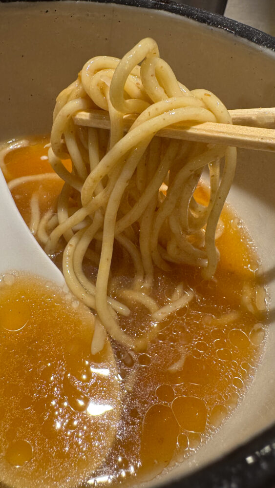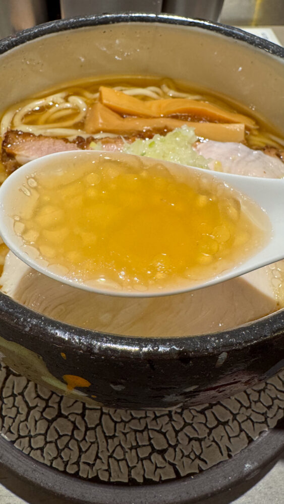 ▲スープが透き通っていて貝の旨みが強い。グビグビ飲めちゃう醤油スープですね。