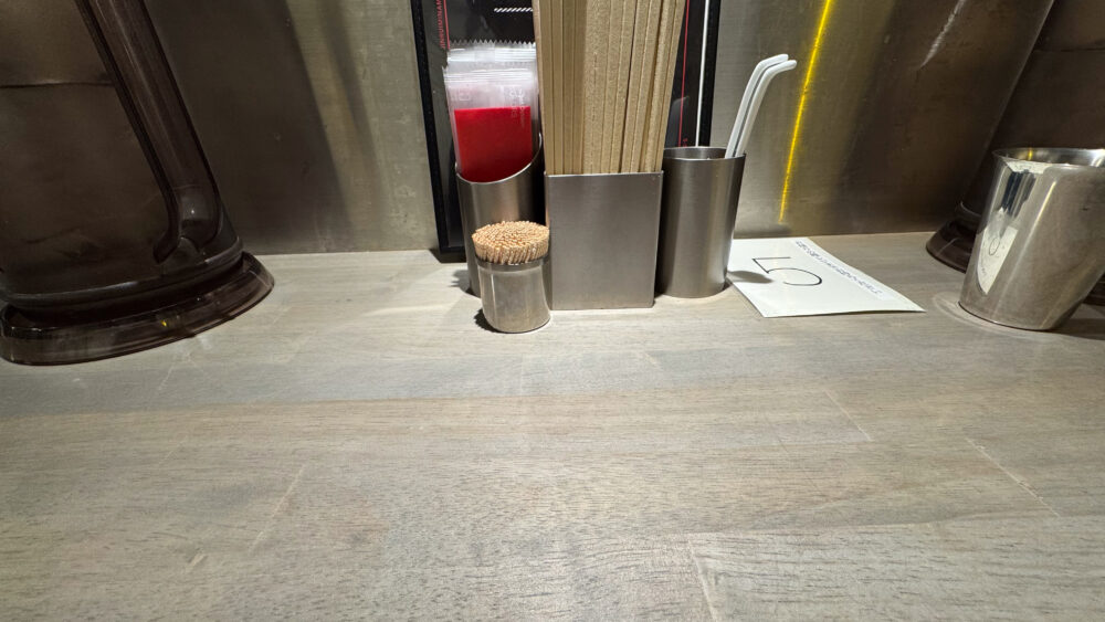 ▲卓上調味料はなし。おしぼりがカラフルなのが印象的。