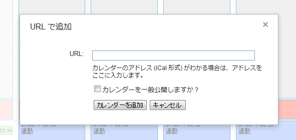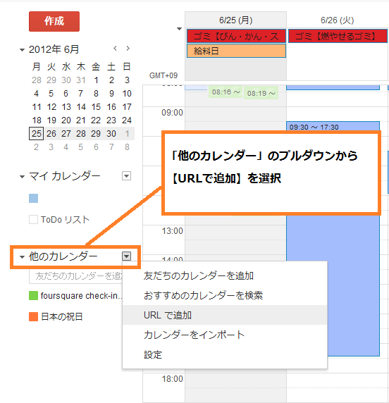 他のカレンダーのプルダウンから【URLで追加】をクリック。