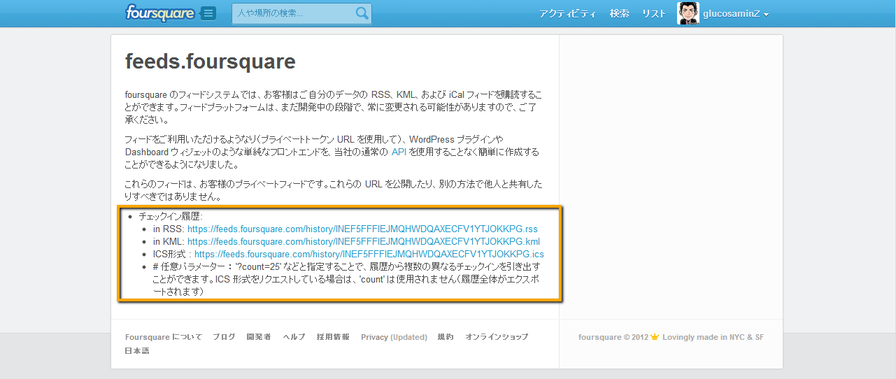 まずは上記のリンク先から自身のfoursquareのfeedの中から2番目のKML形式のものをコピー。