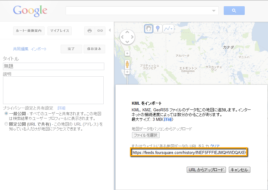 あらかじめコピーしていたfoursquareのKMLのfeedをここにペースト(貼り付け)。