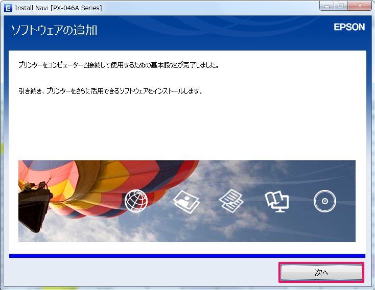 PCとプリンターの接続を無線と優先を選択した上で「次へ」