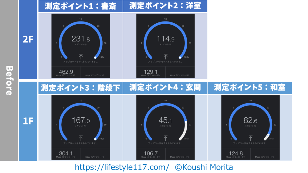 けっこう親機も中継機も良いスペックのものを使ったものの、スピードテストの結果(使用サイト:Googleインターネット速度テスト/デバイス:iPhone11 Pro)は各測定ポイントで以下の結果でした。