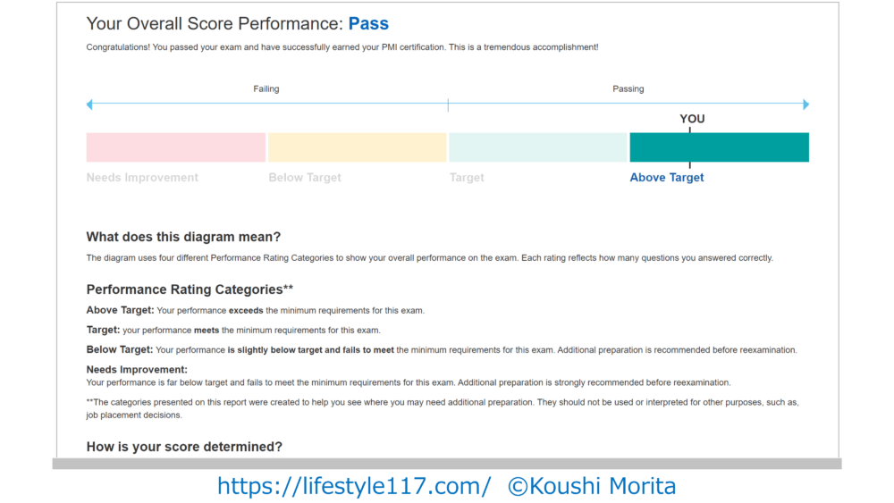 私の試験結果は「Pass」(=合格)で、総合評価は「Above Target」(=4段階中最高評価)でした!
