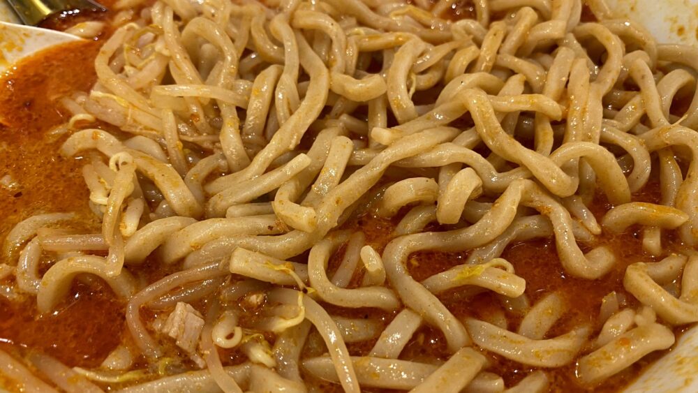 口に入れると、ムチっと食感でコシが強く、坦々スープに負けない麺ですね。