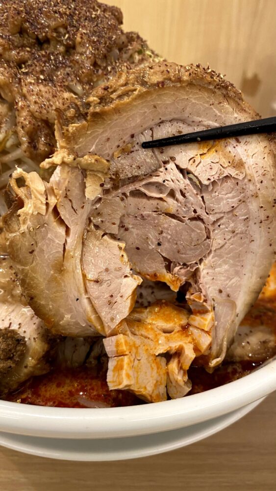 パッと見は盛りの良い二郎系な一杯ですが、野菜の上に降り注ぐ花椒と赤いスープが印象的ですね!