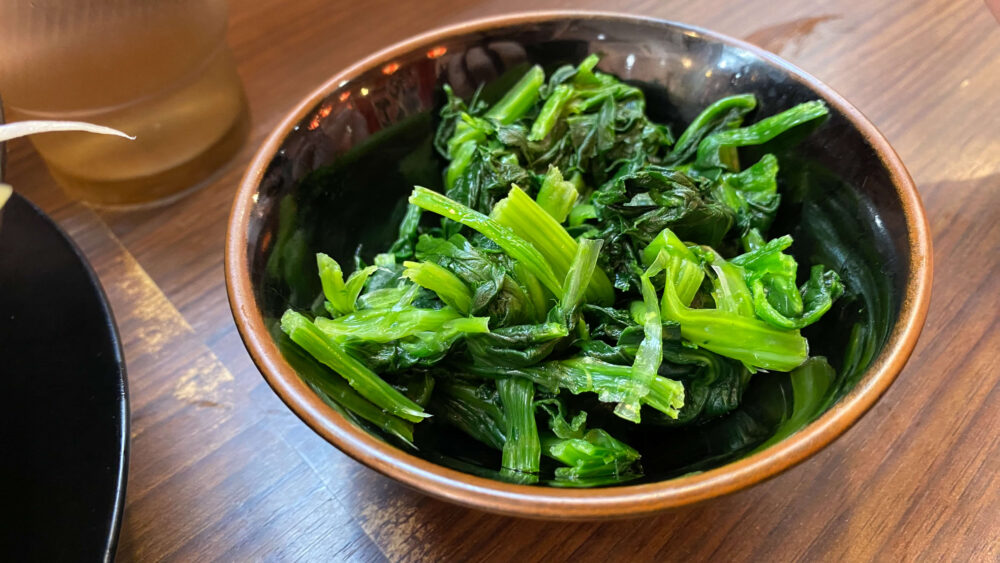 ▲アプリ登録してすぐにもらえるクーポンでほうれん草を無料オーダー。家系のほうれん草はスープに浸すと完全におかず。