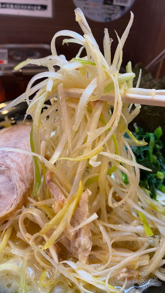 ▲ゴマ油が効いたネギはシャキシャキ食感。麺やスープといっしょに味わうと最高です。