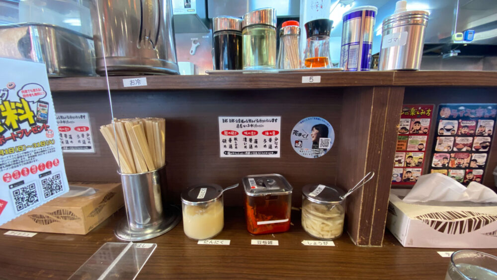 ▲卓上調味料はにんにく、豆板醤、しょうが、醤油、お酢などめちゃくちゃ豊富です。