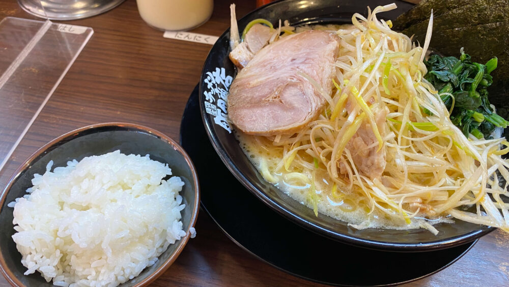 白髪ネギがどっさり乗った家系ラーメンとライスが食欲をそそります!