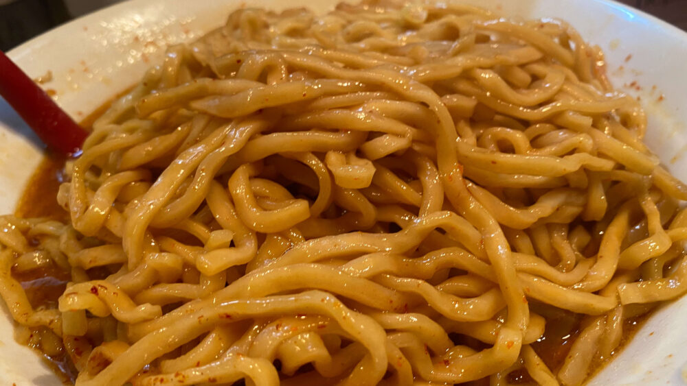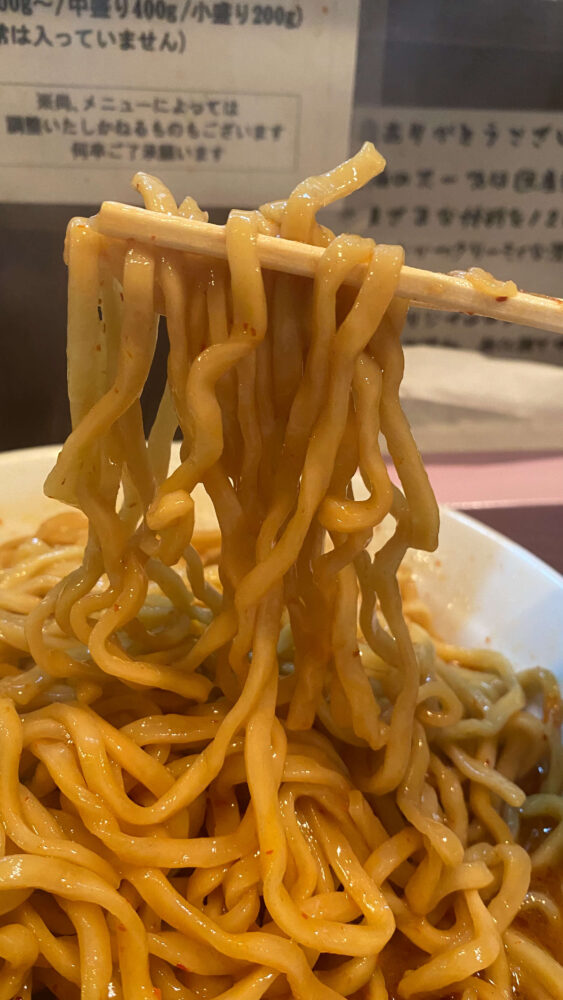 ▲麺は二郎系の中では細め。ツルモチですすり心地が良し。