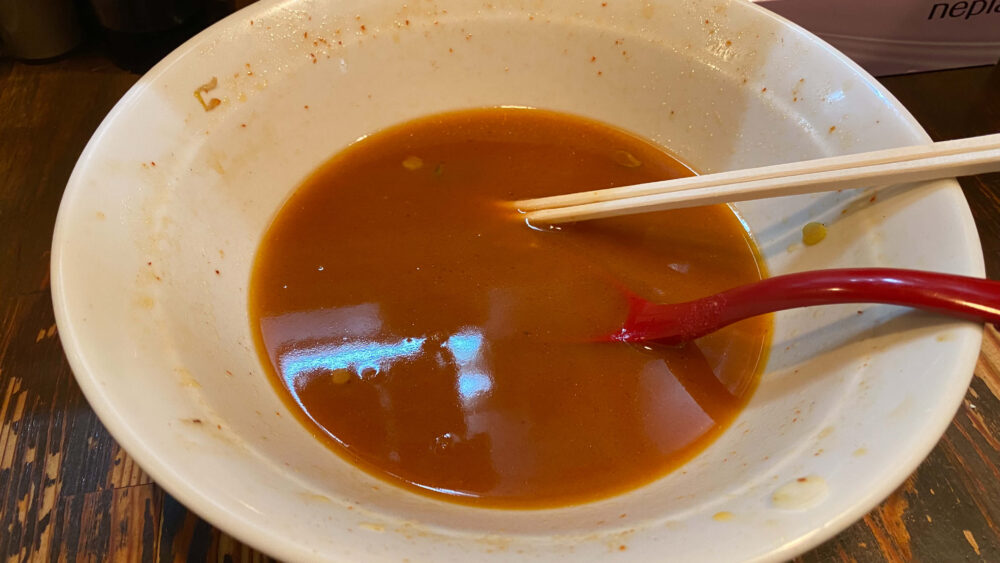 ▲スープが魚介系の旨味があってオリジナルな味わい。辛味が増されていてけっこうピリ辛。
