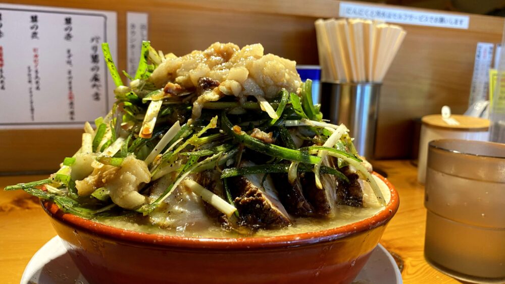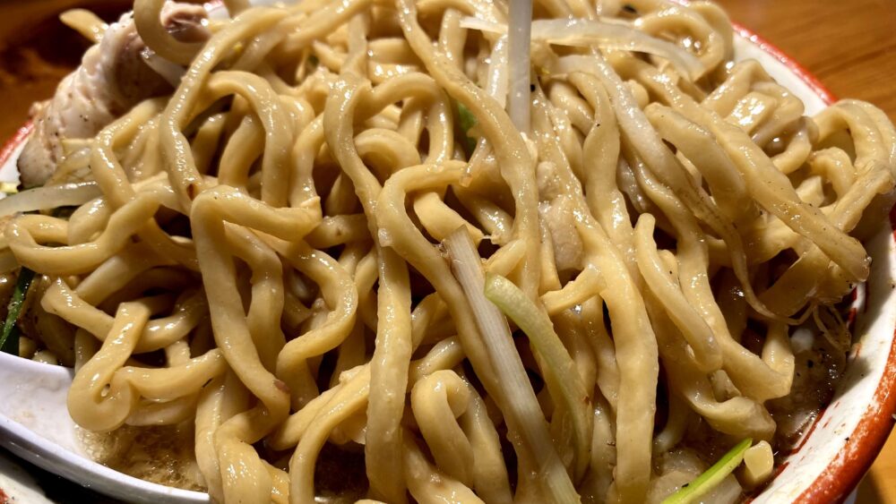 こちらのブログによるとデフォルトで800g相当なので、麺大盛り+豚増しで+200g以上かなと推測し、ボリュームは”3”にしています。