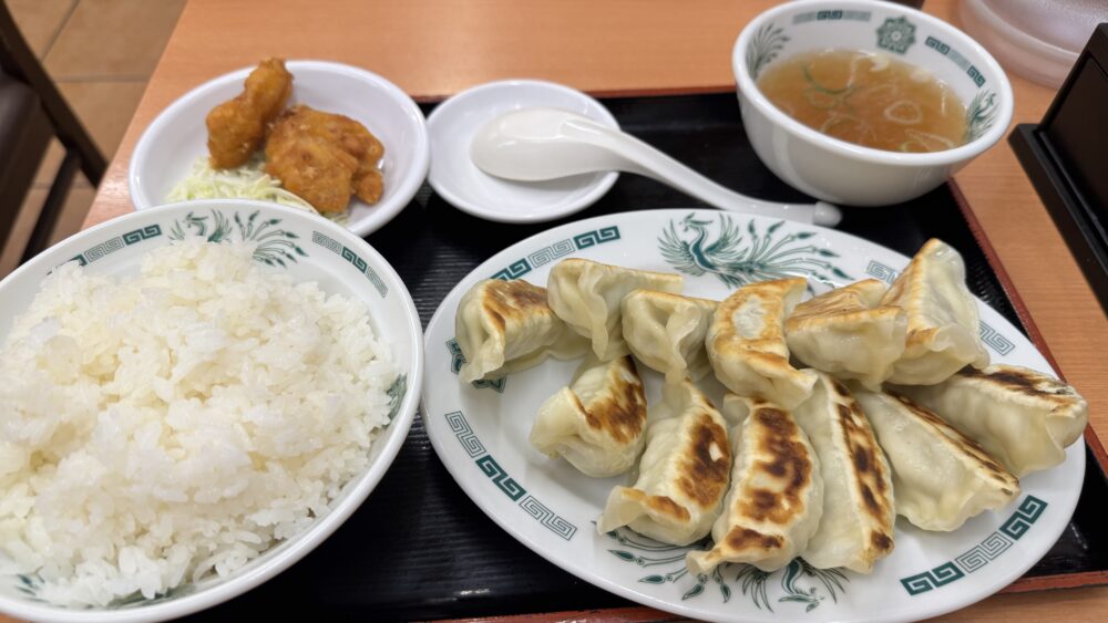 ▲続いて、W餃子定食が着皿。餃子12個に唐揚げ2個はライス大盛じゃなきゃマネジメントしにくいですね。