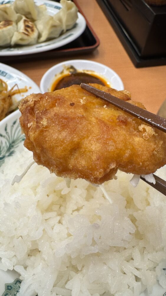 なお、W餃子定食は唐揚げ(2個)か白菜キムチを選択できますが、ボリューム重視で唐揚げ(2個)をチョイス。