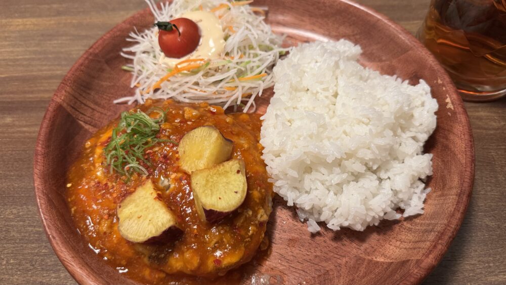 チーズダッカルビ風バーグディッシュが着皿!ソースがかなり赤くて辛旨そう!