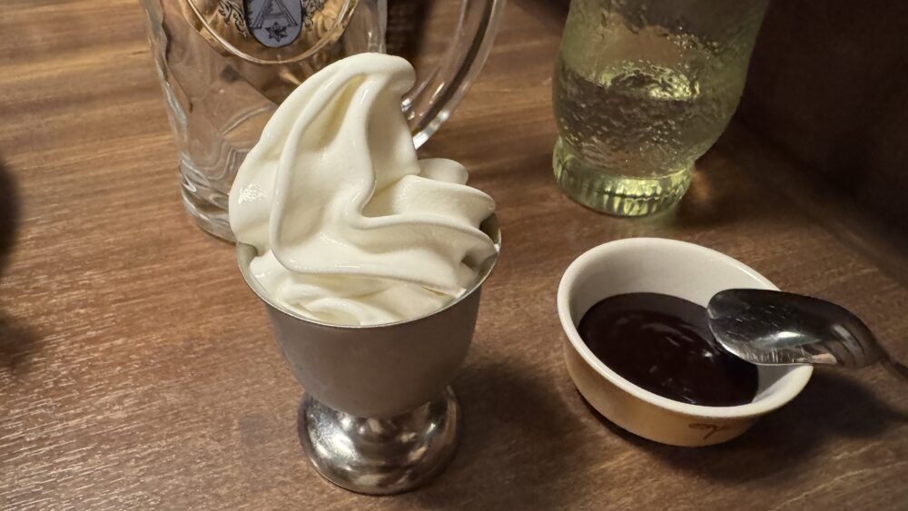 ▲食後のデザートに北海道ミニソフトチョコソース。びくドンのソフトクリームはミルクも濃厚で旨い。