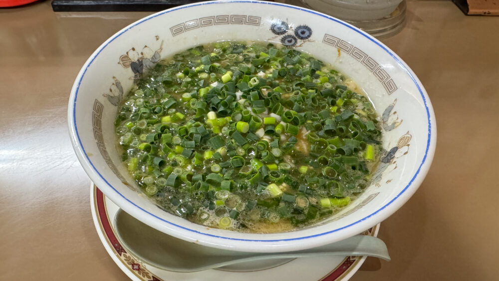 すっぴんラーメンが着丼!スープ一面に浮かぶ大量のネギが印象的。豚骨の良い香りが食欲をそそります。