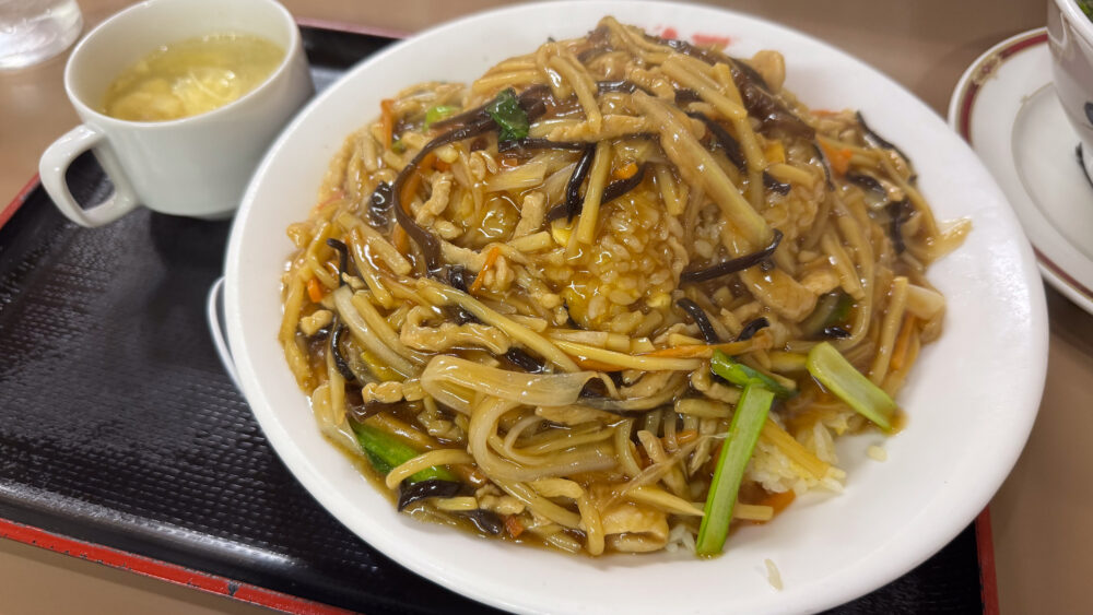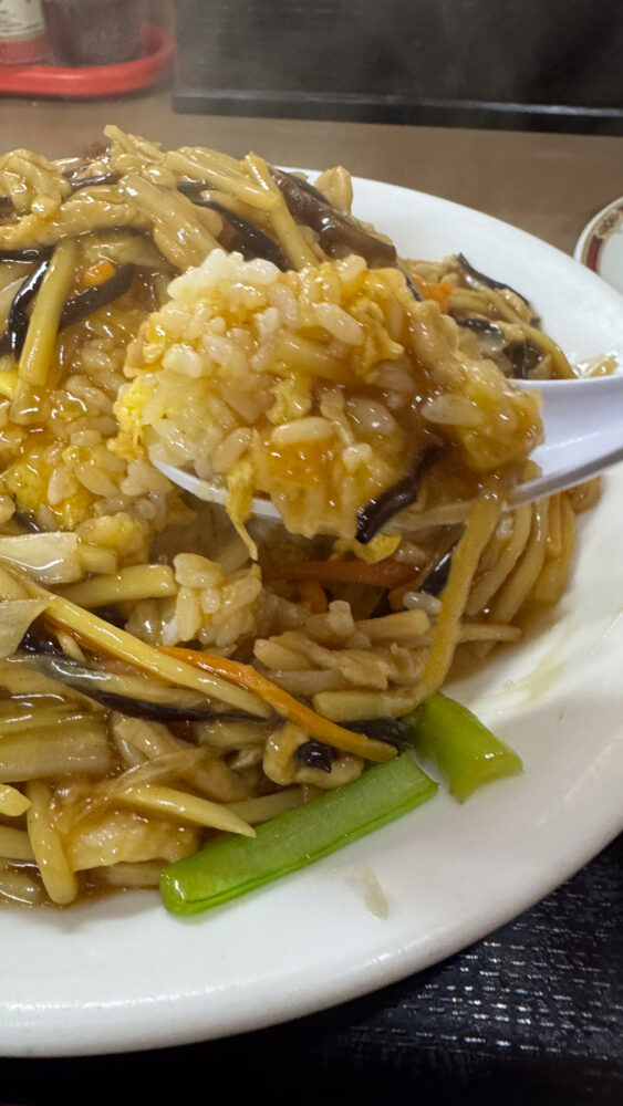 ▲ベースのチャーハンも味付けしっかりめなのに加え、あんかけも濃い目の味付けで旨い。タケノコやきくらげなどの食感も良いアクセント。