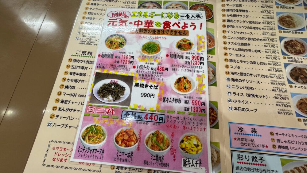 ▲メニューから注文します。上はレギュラーメニュー、下は別紙の「元気・中華」のメニュー表。
