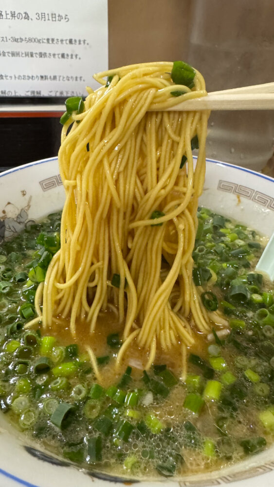 ▲麺は豚骨ラーメンのような細麺。パツっと食感でスープの持ち上げも良くて美味。