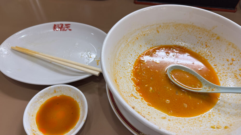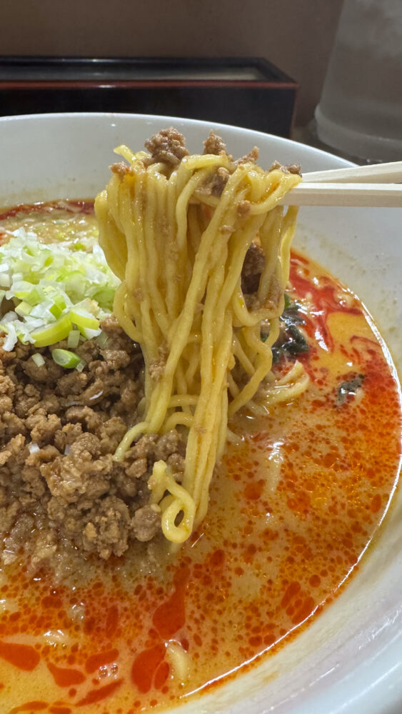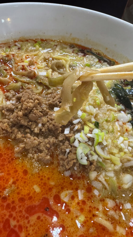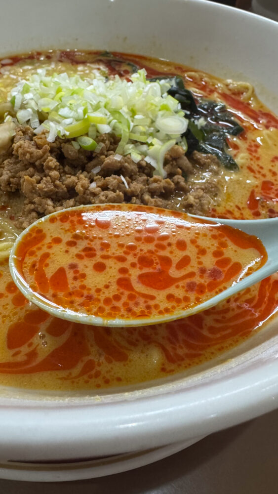 ▲スープは、ラー油が回っていてピリ辛なスープが辛旨。ゴマ感よりラー油が上振れな感じ。