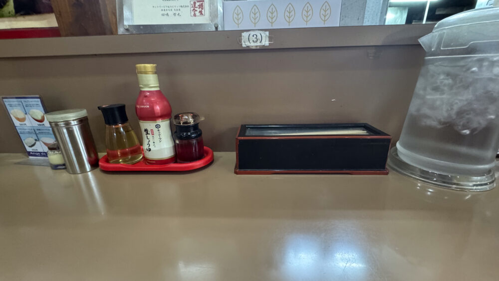 ▲卓上調味料は、おろしにんにく、胡椒、お酢、醤油、ラー油。