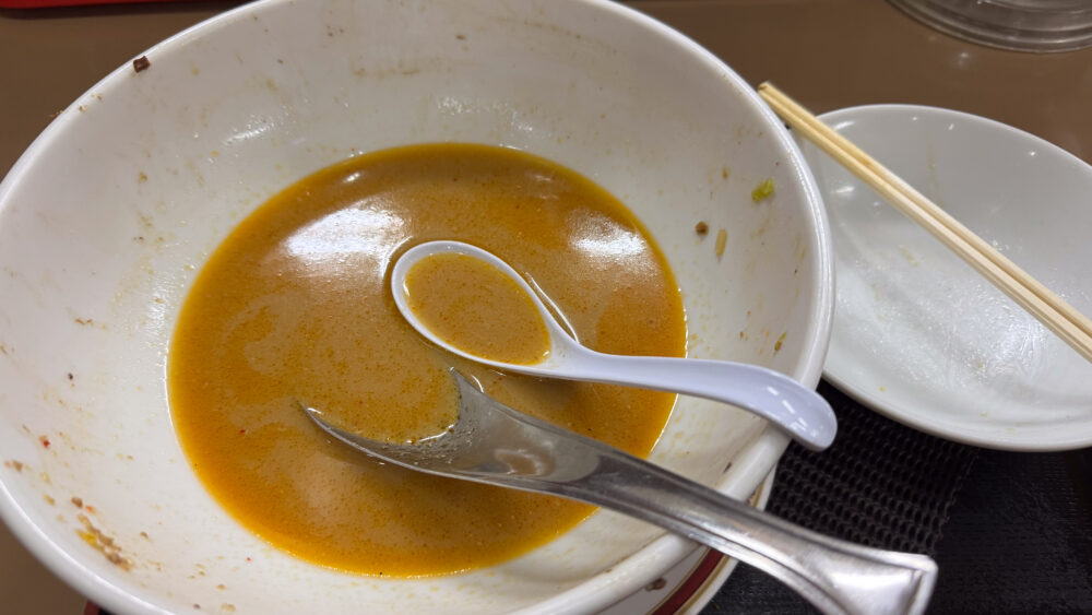 ▲途中、卓上のラー油でピリ辛に味変。味噌には辛味が合いますね。