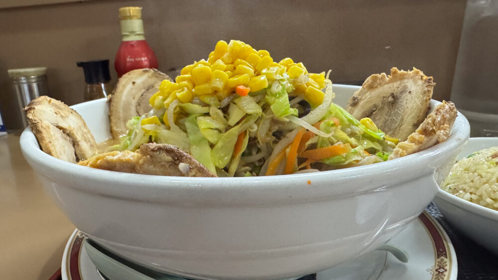 ▲横から見ると、二郎系かと思うほどの標高。ちなみに丼がデカいので、見た目以上に量があると実感します。