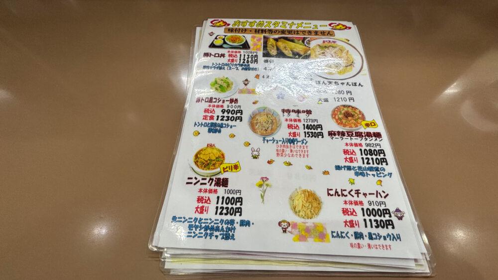 ▲メニューから注文します。上がおすすめスタミナメニュー、下がレギュラーメニュー。