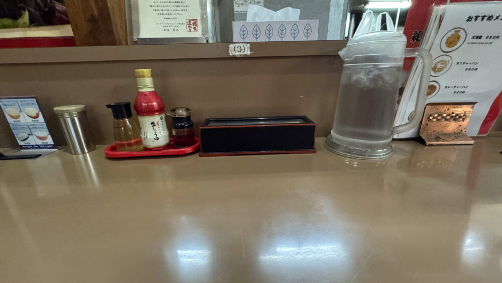 ▲卓上調味料は、おろしにんにく、胡椒、お酢、醤油、ラー油。