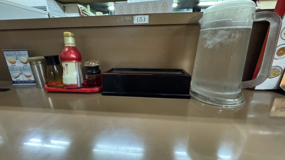 ▲卓上調味料は、おろしにんにく、胡椒、お酢、醤油、ラー油。