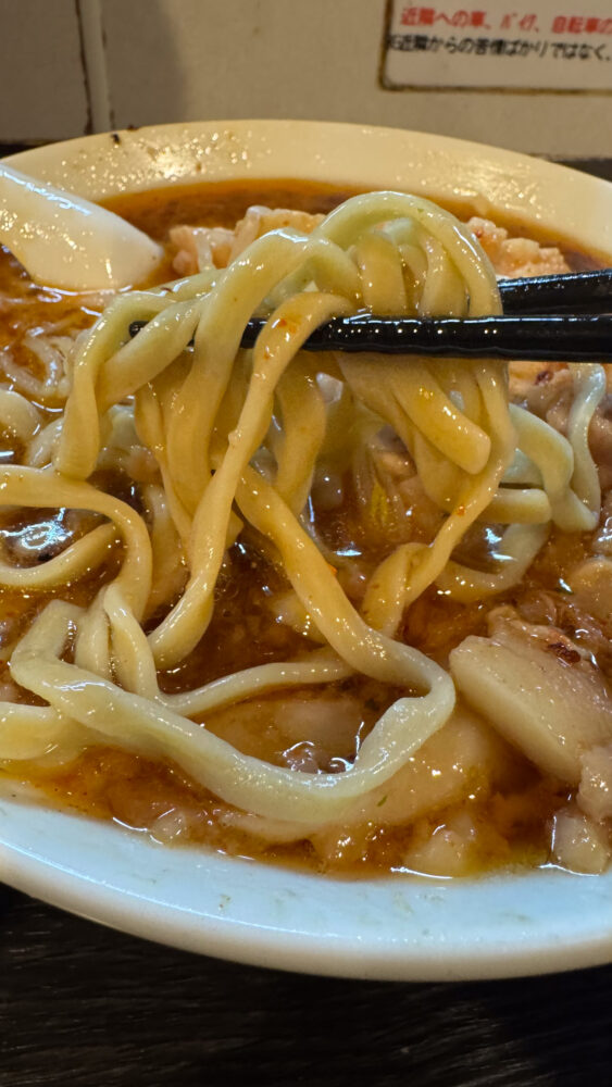 ▲麺は、平打ち気味で太め。水で締められているのでツルワシな食感で旨い。