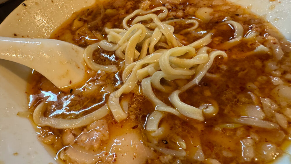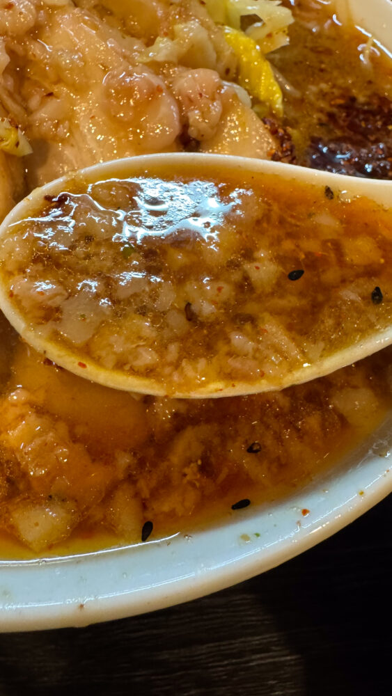 ▲つけ汁は、背脂の量が多く油膜が張ってあり、おそらく非乳化。濃厚ですが、酸味・辛味もあって美味しい。