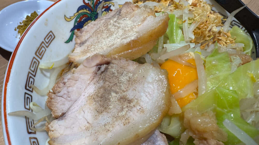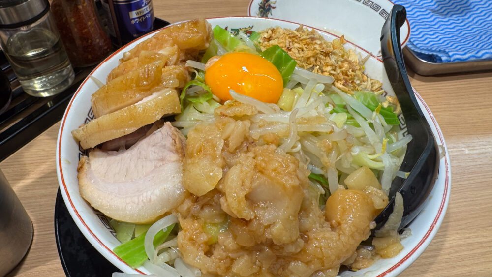 「大汁なし(大ぶた/野菜アブラマシマシカラカラ)+生玉子+ぶっカリー」を実食!