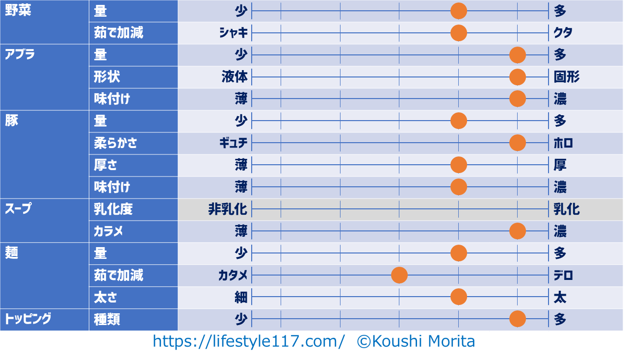 汁なしのため、スープの乳化度はグレーアウトしています。