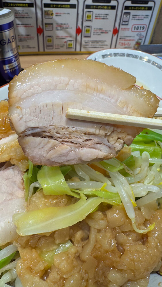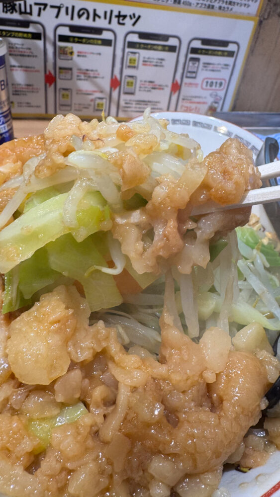 ▲野菜はクタ気味でキャベツ多めで甘い。塩味のあるプルプルなアブラと一緒に食べると最高です。