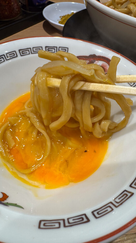 ▲生玉子ですき焼き風に味変。麺の味が濃いめなので、めちゃくちゃマイルドになって美味しい。