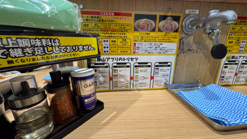 ▲卓上調味料はカエシ・一味唐辛子・ブラックペッパー・ホワイトペッパー・お酢。コールの方法も丁寧に記載されています。