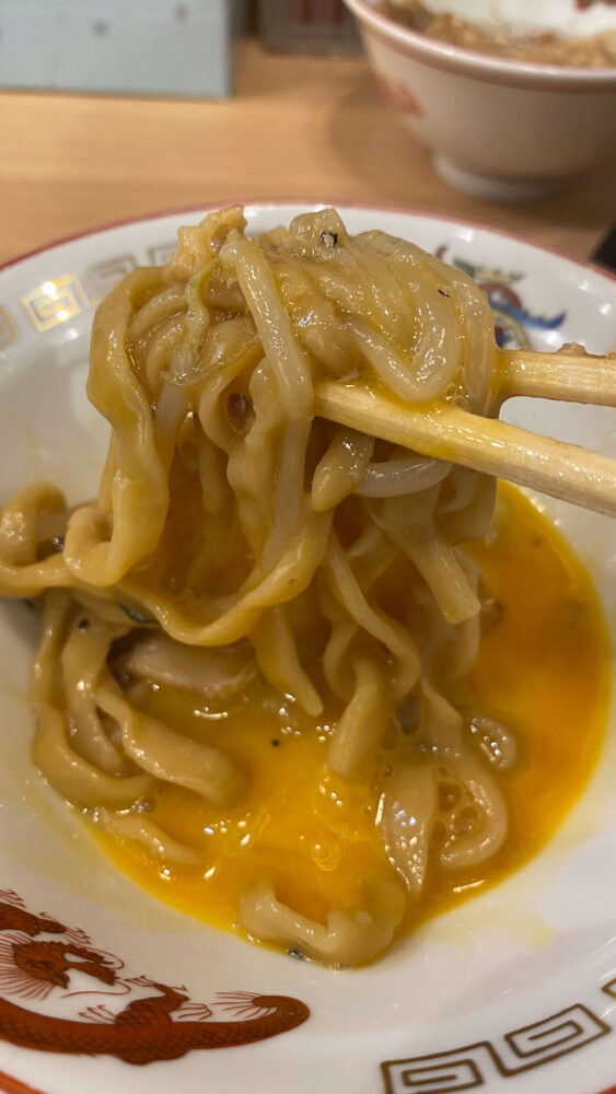 ▲生玉子でも味変。こちらはジャンクさをマイルドにしてくれ、さらにデュルンとすすり心地もアップ。