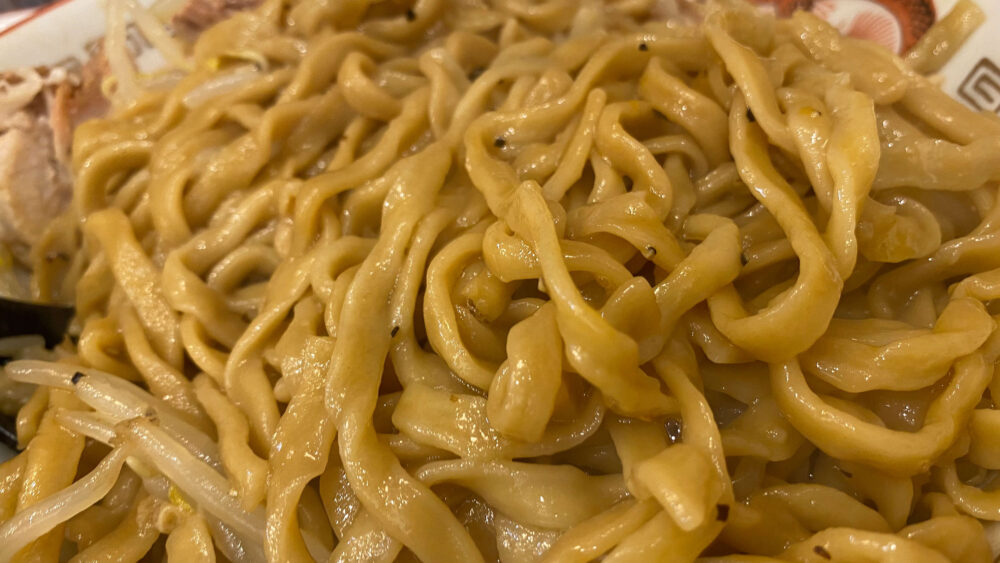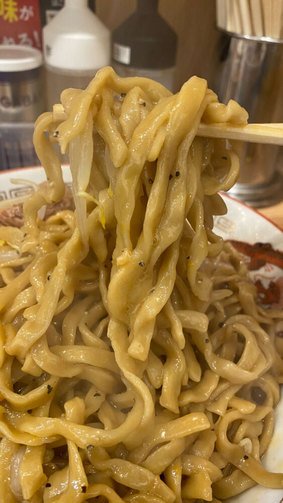 ▲麺はやや平打ち短めでデロ気味。タレがよく絡み、ブラックペッパーの風味も感じるジャンクな味わい。