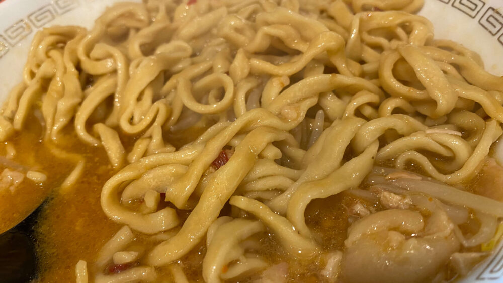 ▲麺はやや平打ち短めでデロ気味。味噌スープをまとった麺が美味しいです。