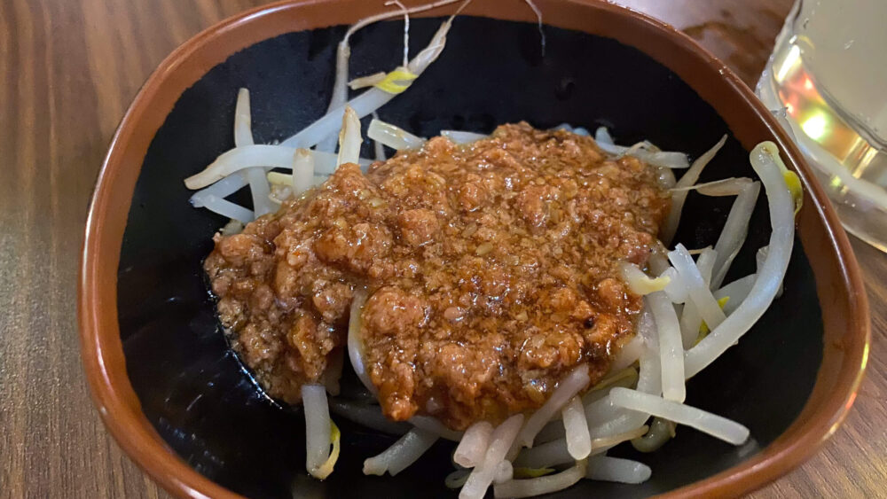 ▲お通しはもやし肉あんかけ。お酒が進む味わい。