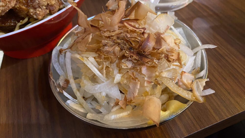 ▲唐揚げのタレが濃いめなので、清涼剤としてオニオンスライスを注文。味覚のリセットに大活躍。