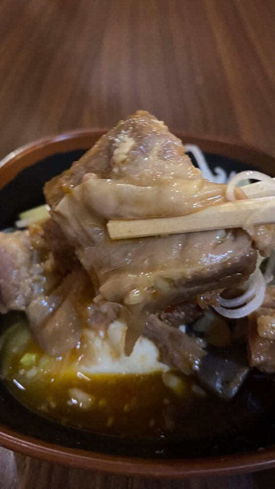 ▲メニュー名通りピリ辛で美味しいです。角煮も良いホロホロ感。