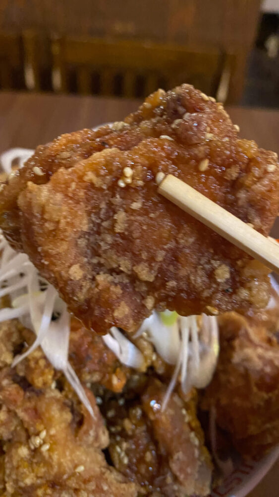 ▲若鶏の唐揚げバカ。醤油ダレと辛ダレのハーフ。