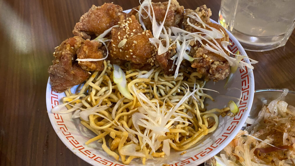 ▲唐揚げの途中経過。唐揚げ到着から13分後くらい。唐揚げの下にはフライ麺がけっこう入っています。