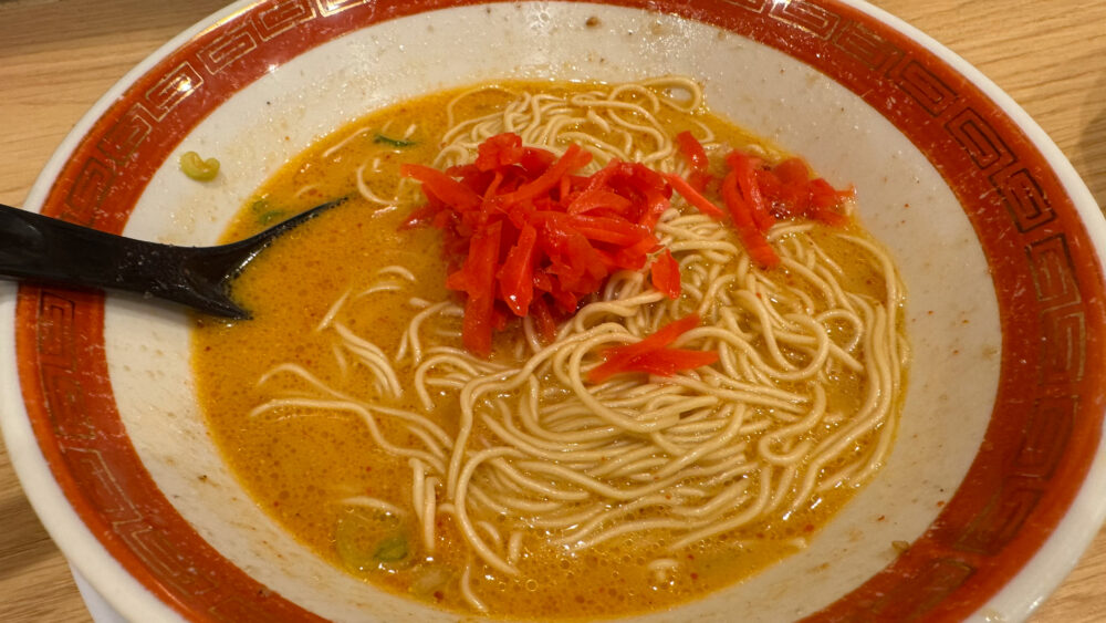 ▲替玉をスープに入れ、卓上の紅生姜を投入して味変。紅生姜が入るとドラクエの「凍てつく波動」のようにリフレッシュ効果がすごいですね。